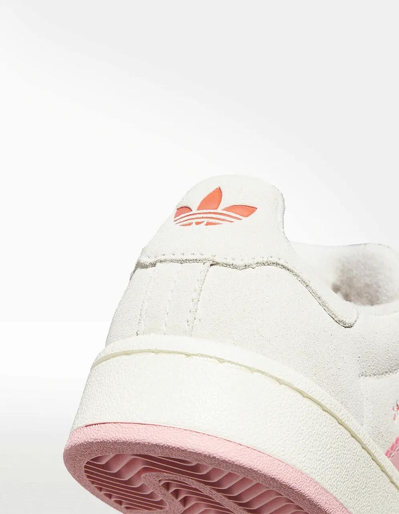 El amor y la amistad se comparte todo el año y este para para niños y niñas cuenta con un diseño bastante lindo en un Campus 00S. En la base encontramos un color gris cremoso y detalles en color rosa que destaca en las agujetas, la suela y el detalle de trifolio en el cual encontramos un patrón de corazones que combina con las plantillas. El logo y el talón con un detalle naranja.