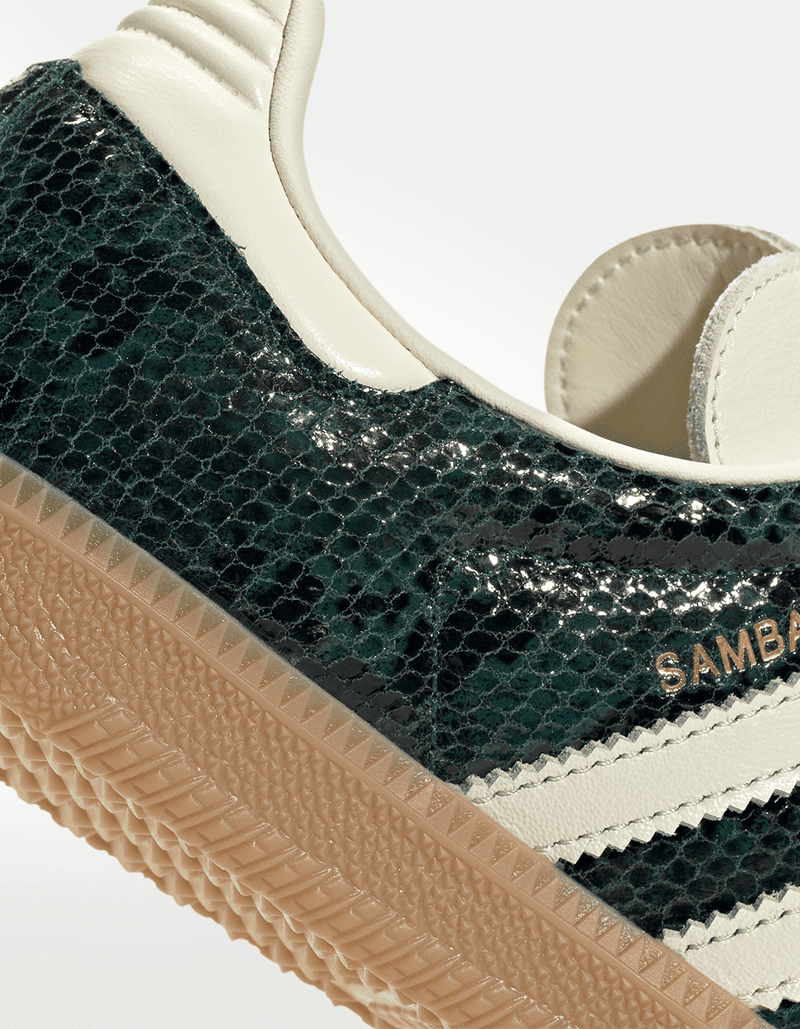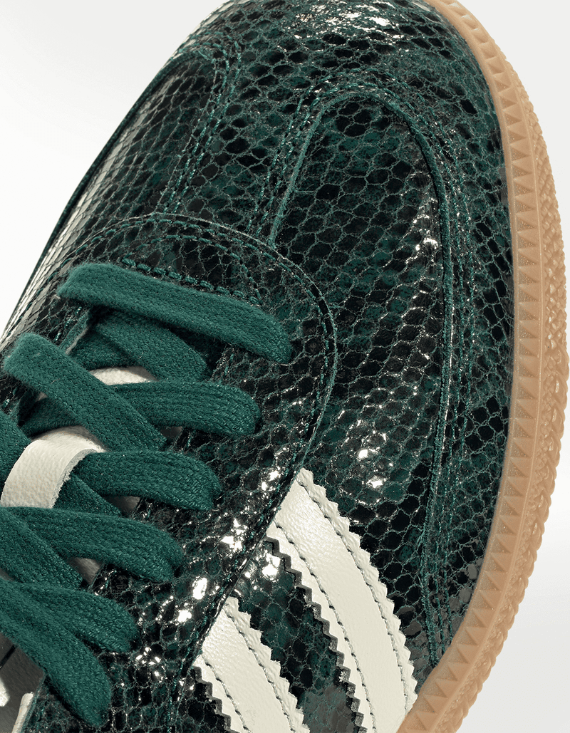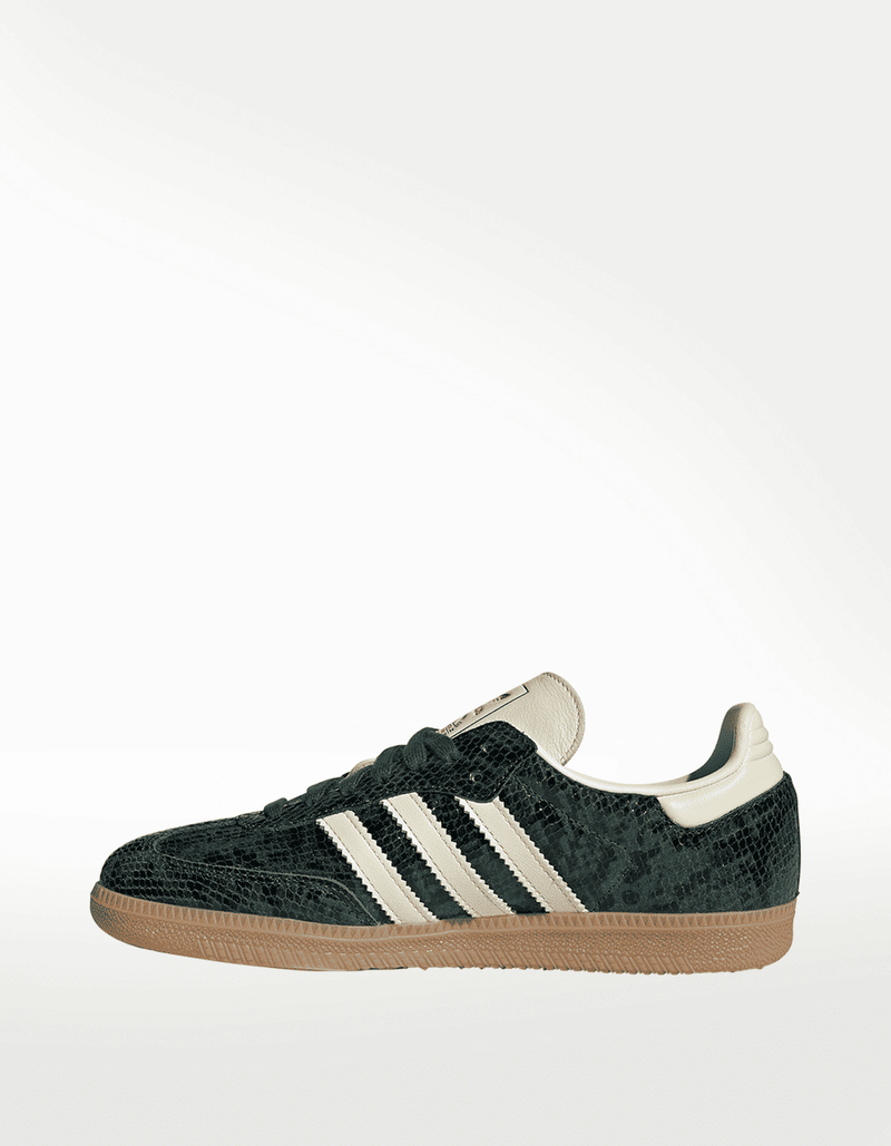 Uno de los modelos con más "culto" de los últimos años para la casa deportiva ha sido sin duda alguna el Samba, un modelo que hoy es utilizado por fashion bloggers o personalidades del cine, está al alcance de un click. El par es simple pero directo. El par en esta ocasión nos entrega un upper con una increíble versión de "snakeskin" en la parte superior en verde brilloso.