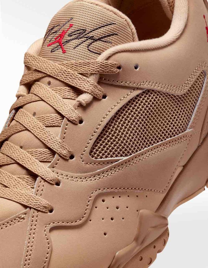 Si pudiera haber una evolución del Jordan 7, esta versión RM sería esa. Un par que toma como inspiración el modelo lanzado en 1992 y que en pleno 2025 presenta nuevas adaptaciones con un terminado de corte Mid y una combinación de colores increíbles que combinan gamuza arena con detalles en rojo. En cuestión de materiales encontramos un upper de gamuza lisa y malla y detalles únicos.